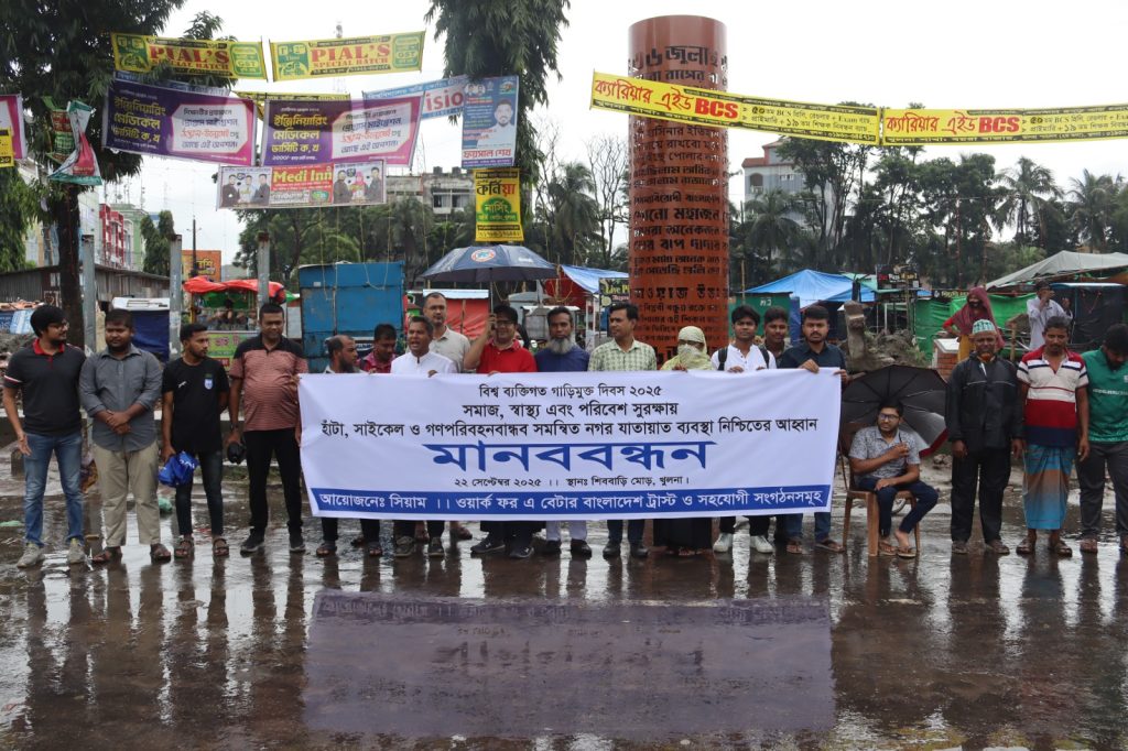 খুলনা নগরে মানসম্পন্ন কোন গণপরিবহন ব্যবস্থা না থাকায় অটোরিকশা বা ইজিবাইকে অধিক ভাড়ায় যাতায়াতে বাধ্য হচ্ছেন নগরবাসী। খুলনা সিটি করপোরেশনের নিবন্ধিত সংখ্যার চেয়ে অনেক বেশি ইজিবাইক রাস্তায় চলাচল করছে। এ সকল বাহনের বেপরোয়া চলাচলে দুর্ঘটনা, পথচারীদের ভোগান্তি, যানজটসহ নানা সমস্যায় পর্যুদস্ত নগরবাসী। এই সমস্যাগুলো থেকে মুক্তি পেতে হলে ব্যক্তিগত গাড়ির ব্যবহার নিয়ন্ত্রণ করা এবং মানসম্মত গণপরিবহন ব্যবস্থার উন্নয়ন, হাঁটা ও সাইকেল চালানোর জন্য উপযোগী পরিবেশ তৈরি করা জরুরি। ২২ সেপ্টেম্বর ২০২৫, সকাল ১১.০০ টায় সোশ্যাল এন্ড এনভায়রনমেন্টাল ইনক্রিজিং এনালাইসিস মুভমেন্ট (সিয়াম) এবং ওয়ার্ক ফর এ বেটার বাংলাদেশ (ডাব্লিউবিবি) ট্রাস্ট এর যৌথ উদ্যোগে খুলনা নগরীর শিববাড়ির মোড়ে “সমাজ, স্বাস্থ্য এবং পরিবেশ সুরক্ষায় হাঁটা, সাইকেল ও গণপরিবহনবান্ধব সমন্বিত নগর যাতায়াত ব্যবস্থা নিশ্চিতের আহ্বানে” মানববন্ধনে বক্তারা এ কথা বলেন।