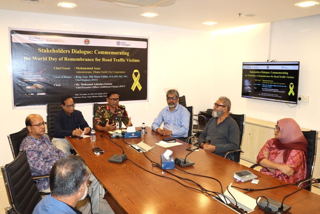 Dhaka North City Corporation (DNCC) today observed the ‘World Day of Remembrance for Road Traffic Victims’ to commemorate those killed and injured on the roads, with the participation of relevant government and non-government organizations. Marking the occasion, a roundtable discussion was held this afternoon at the conference room of the Nagar Bhaban, with technical support from the Bloomberg Philanthropies Initiative for Global Road Safety (BIGRS) and Vital Strategies. The event was moderated by BIGRS Initiative Coordinator and former Additional Secretary, Md. Abdul Wadud. DNCC’s Chief Engineer Brig. Gen. Md. Moin Uddin, SUP, SPP, NDC, PSC attended as guest of honor, while Aminul Islam Sujon, Technical Adviser of Vital Strategies, delivered the keynote presentation.
