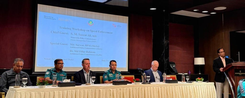 ঢাকায় গতিসীমা নিয়ন্ত্রণ নির্দেশিকা বাস্তবায়নের মাধ্যমে সড়ক নিরাপত্তা নিশ্চিত করতে পুলিশ সদস্যদের দক্ষতাবৃদ্ধির লক্ষ্যে গতকাল ও আজ দিনব্যাপী কর্মশালা অনুষ্ঠিত হয়েছে। ব্লুমবার্গ ফিলানথ্রপিস ইনিশিয়েটিভ ফর গ্লোবাল রোড সেফটি (বিআইজিআরএস) এর আওতায় ঢাকা মেট্রোপলিটন পুলিশ (ডিএমপি) ও গ্লোবাল রোড সেফটি পার্টনারশিপ (জিআরএসপি) এ প্রশিক্ষণ আয়োজন করে।